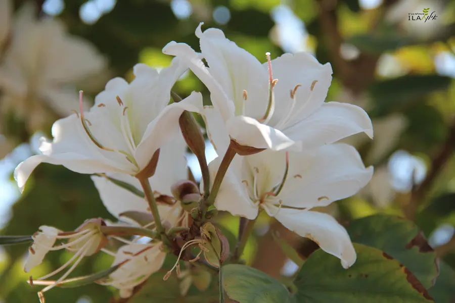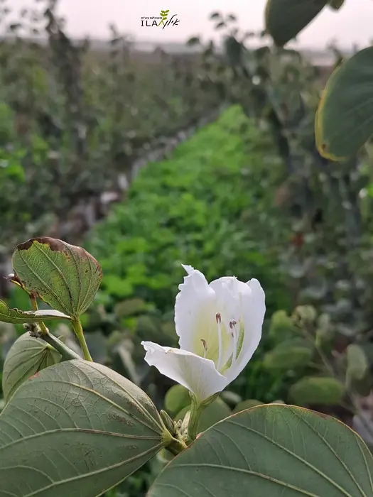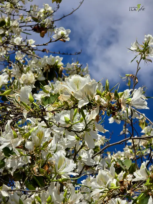للبوهينيا الملوّنة البيضاء تاج دائري–بيضاوي، ذات طابع شُجيري ومظهر نحتي. أوراقها قلبية الشكل بطول نحو 10–20 سم. يصل ارتفاعها عند البلوغ إلى نحو 12 م. سهلة الزراعة ولها قدرة تحمّل بارزة. تناسب معظم أنواع التربة باستثناء المالحة. مقتصدة جدًا في حاجتها للماء، ويُنصح بريّ مساعد فقط في سنواتها الأولى حتى تستقر. يمكن تشكيلها كمتعدّدة الجذوع. إزهارها عطِر وبارز باللون الأبيض. مشهد الإزهار مبهر بشكل خاص، ويُعدّ من أجمل المشاهد في البلاد. تزهر في الربيع (أواخر مارس – أوائل أبريل) لمدة نحو ثلاثة أسابيع. ثمارها قرون طويلة تحوي عدّة بذور. تجفّ هذه القرون وتتحوّل إلى اللون البني مع شكل ملتف قليلًا. تبقى على الشجرة فترة طويلة فتُعكّر منظرها وتشوّه جمالها.