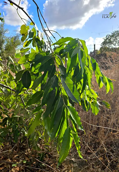 עלים : לסירוגין, עלים אליפטיים-חרמשיים בצבע ירוק כהה באורך של 10-20 ס”מ