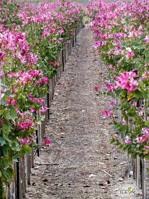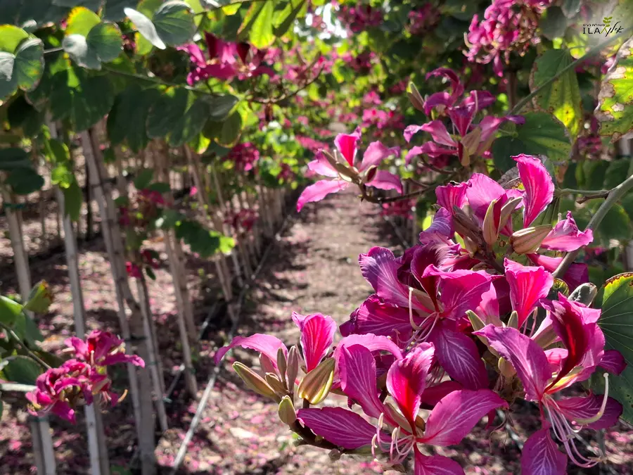 נוף הבוהיניה עגלגל–אובלי, ומראהו של העץ פיסולי. כבוגר הוא מגיע לגובה ממוצע של כ-12 מ’. נוח לגידול ובעל עמידות מרשימה. מתאים לרוב סוגי הקרקע, למעט אדמות מלוחות. חסכוני למדי במים, ומומלצת השקיית עזר רק בצעירותו – עד להתבססות. ניתן לעצב את הבוהיניה כרב-גזעית. עלי העץ בצורת לב. לבוהיניה יש פריחה מהיפות בארץ. זן מורכב שעליו גאוותנו הוא בוהיניה אדומה “פנינה” שלנו. ייחודה הגדול הוא בהיותה בוהיניה עקרה. כלומר אין לה את הפרי, התרמילים החומים והרבים שפוגמים במראה העץ ובמרכיב הנוי שלו. ויתרון נוסף שאנו משמרים בזן זה – פריחות מרשימות לכל אורך חודשי החורף. מעל 120 יום ברציפות, מחודש נובמבר ועד אפריל (!).לאחר הפריחה בצבעי אדום, העץ מבצע החלפת עלים במשך שבועיים-שלושה ולאחר מכן הוא מלבלב ומציג עלווה ירוקה רעננה ועשירה לאורך כל השנה. את העץ מעטרת פריחה קלה לסירוגין לאורך כל השנה, עד לתקופת הפריחה המשמעותית שמתחילה כאמור בסביבות נובמבר.