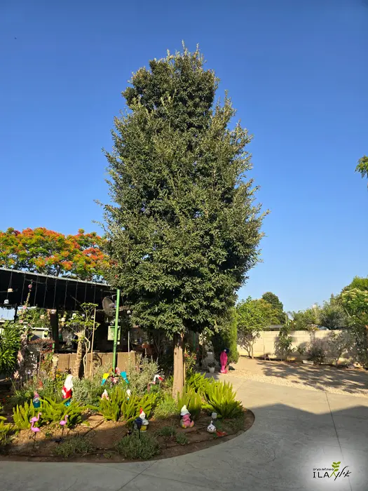 כאמור, צורת הצמרת מעוגלת–זקופה, סימטרית יחסית, והוא מגיב היטב לגיזום ולעיצוב. העלים הקמורים ירוקים כהים, מבריקים, עבים ובעלי שפה מפורצת משלבים קשיחות ועמידות מצוינת לתנאי הקיץ הישראלי.
