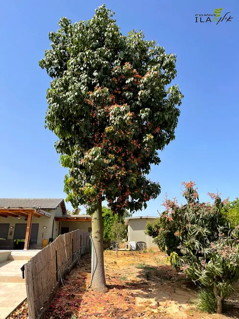 Brachychiton pink acerifolius – A medium evergreen tree with a pyramidal canopy. The tree is a selected, different clone of the Brachychiton acerifolius (apparently a hybrid of the Brachychiton acerifolius and populneus) that blooms in early spring, as early as March, and continues to bloom in waves until June. The bloom is rich and luminous in light pink, prominent even though the tree is covered with foliage. The leaves are smaller rand more delicate than the original form of the leaves of the Brachychiton acerifolius.